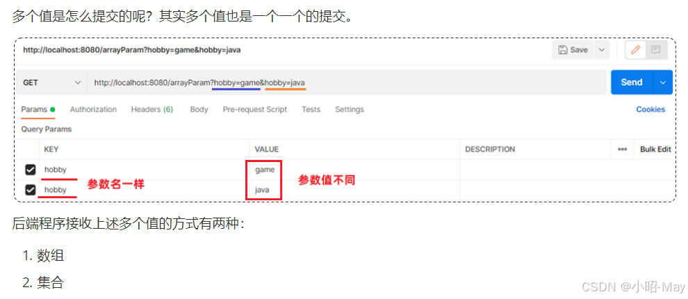 数组集合参数的使用场景:在HTML的表单中,有一个表单项是支持多选的(复选框),可以提交选择的多个值。