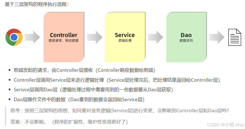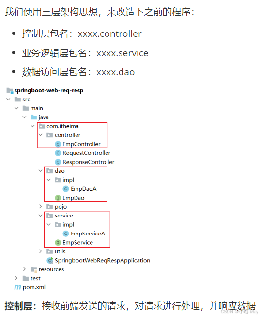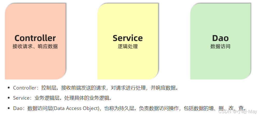 按照上述的三个组成部分,在我们项目开发中呢,可以将代码分为三层: