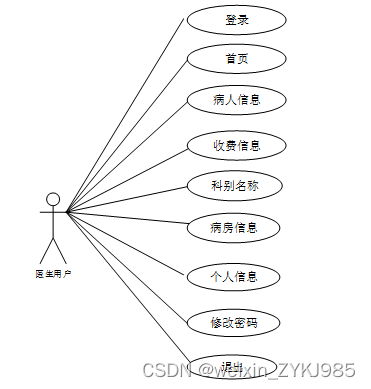 通过2.3功能的分析,得出了本医院住院管理系统的用例图: