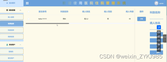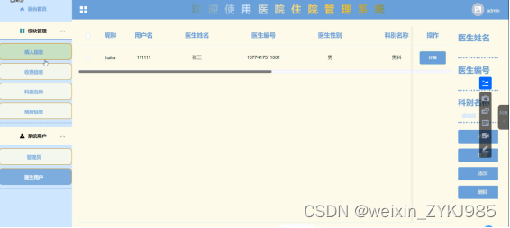 医院住院管理系统的设计与实现是为了让使用者更加方便的进行管理员工相关联的一些信息,使用者查找管理的时候能够节省大量的时间和精力,有效减少不必要的查找时间。系统在功能上划分为医生用户端和管理员端两大部分。