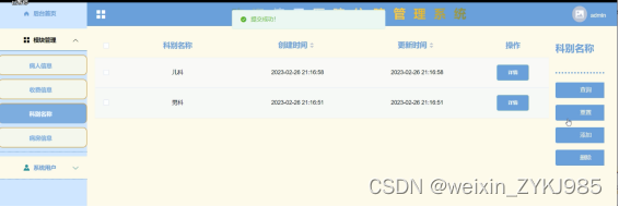 (3)病房信息:点击“病房信息”这个按钮可以查看到系统中所有的病房信息,支持通过科别名称或者病房名称或者病床编号进行查询病房信息,如果想要添加新的病房信息,点击“添加”按钮然后根据提示输入病房信息,点击“提交”后,在病房信息界面就会显示新增的病房信息,可以点击某一病房查看病房信息的详情,也可以直接点击“删除”进行删除病房信息;