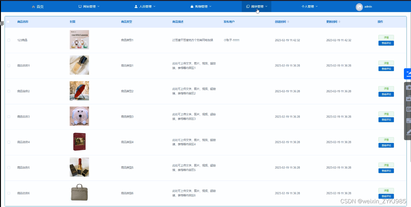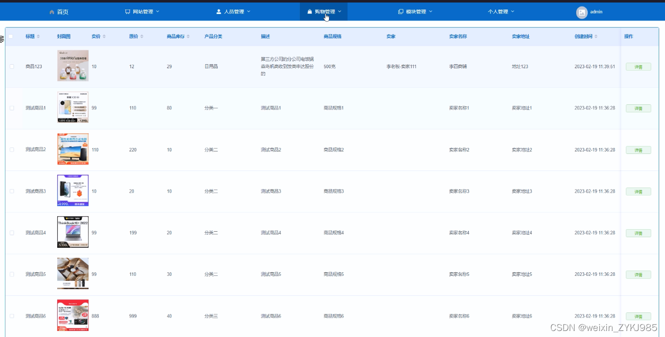 (3)购物管理:当点击“购物管理”这一菜单的时候,会出现商城中心、分类列表、订单列表这三个子菜单,管理员能够对这三个模块进行增删改查操作;