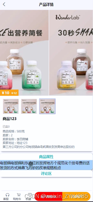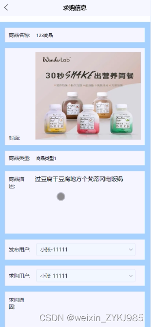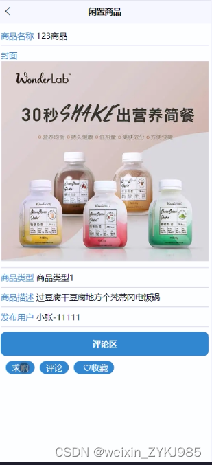 (6)闲置商品:买家可以查看闲置商品,在查询到自己想要了解的闲置商品的时候,可以进入查看详细的介绍,点击“求购”这一按钮以后会跳转到求购信息填写的界面,根据提示填写好求购的信息,点击“提交”以后求购就完成了,在闲置商品详情这个界面,同时支持用户对喜欢的闲置商品进行收藏、点赞、评论的功能。