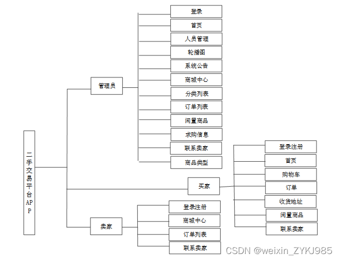 在分析了Springboot二手交易平台APP的真实需求后,将Springboot二手交易平台APP所需要的角色划分整理成了下图2-1和图2-2。