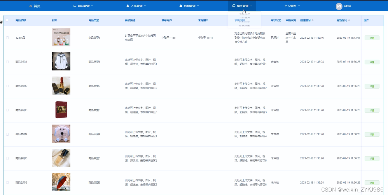 (6)模块管理:当点击“模块管理”这一菜单的时候,会出现闲置商品、求购信息、联系卖家、商品类型这四个子菜单,管理员能够对这四个模块进行增删改查操作;