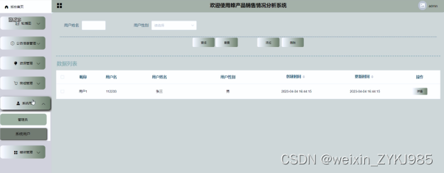 管理员可以对蜂产品销售情况分析系统中所有的用户进行管控,包括了管理员以及系统用户。界面如下图4-11所示。