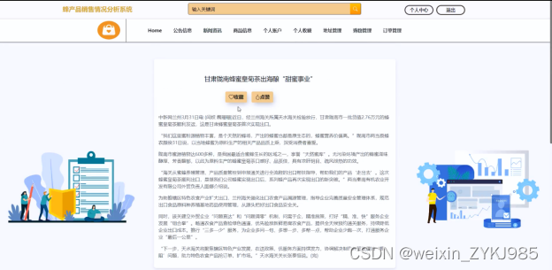 当访客点击蜂产品销售情况分析系统中导航栏上的“新闻资讯”后将会进入到该“新闻资讯”列表的界面,然后选择想要看的新闻资讯,点击进入到详细界面,同时可以进行点赞、收藏、评论操作,新闻资讯界面如下图4-4 所示。