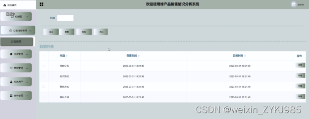 (2)公告信息:管理员点击“公告信息”菜单可以查看到系统中的所有公告信息,对已经存在的公告信息,管理员可以修改,也可以添加新的公告信息或者删除公告信息。