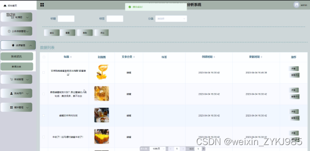 (4)资源管理:管理员可以对蜂产品销售情况分析系统前台展示的新闻资讯以及新闻分类所属的分类进行管控。