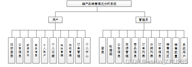 按照蜂产品销售情况分析系统的角色,我划分为了系统用户和管理员这两大部分。