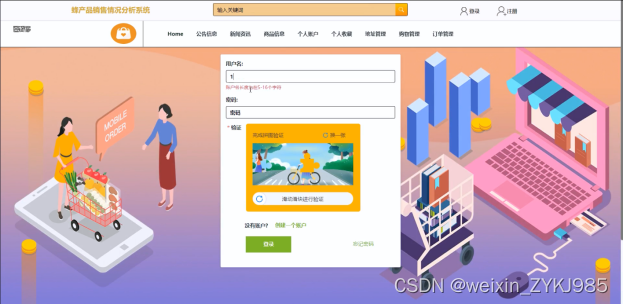 蜂产品销售情况分析系统中的前台上注册后的用户是可以通过自己的账户名和密码进行登录的,当用户输入完整的自己的账户名和密码信息并点击“登录”按钮后,将会首先验证输入的有没有空数据,再次验证输入的账户名+密码和数据库中当前保存的用户信息是否一致,只有在一致后将会登录成功并自动跳转到蜂产品销售情况分析系统的首页中;否则将会提示相应错误信息,用户登录界面如下图4-3所示。