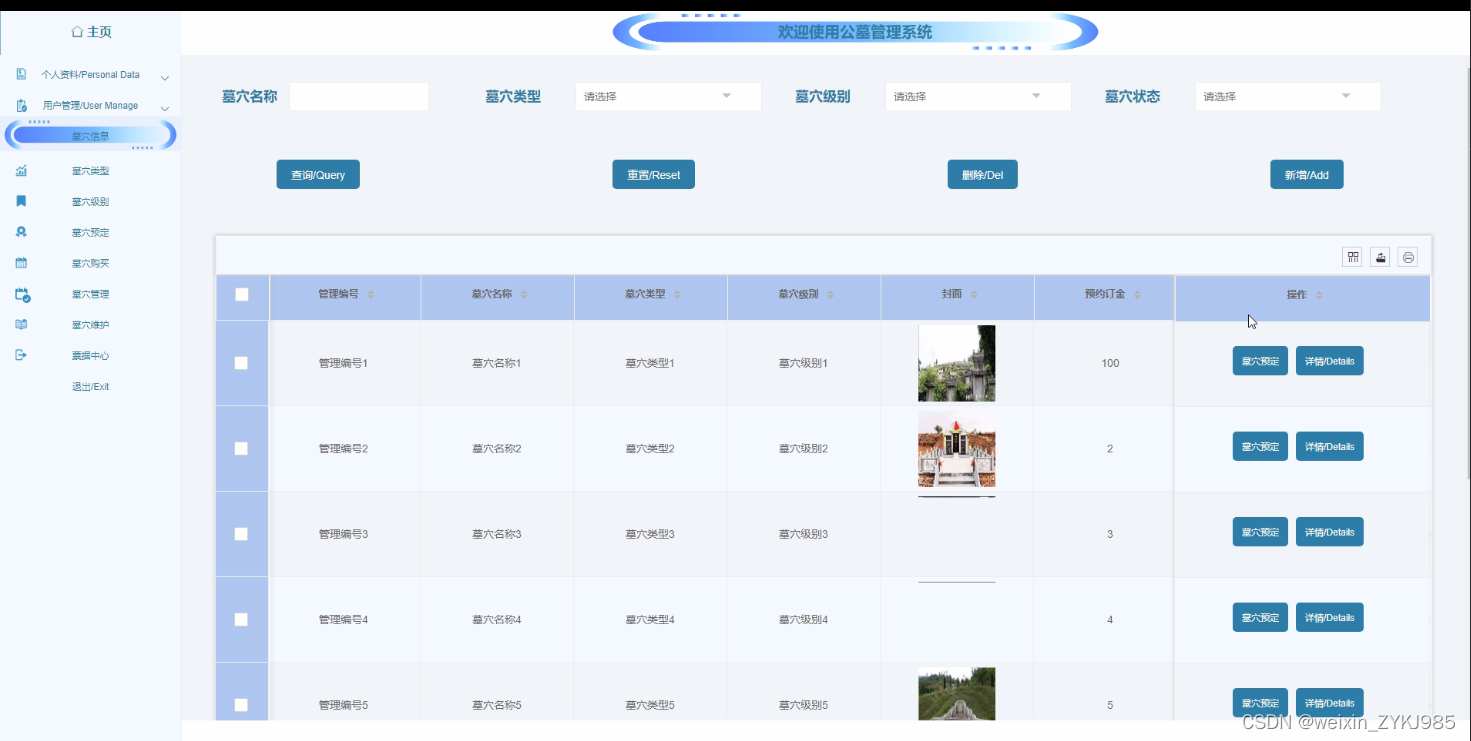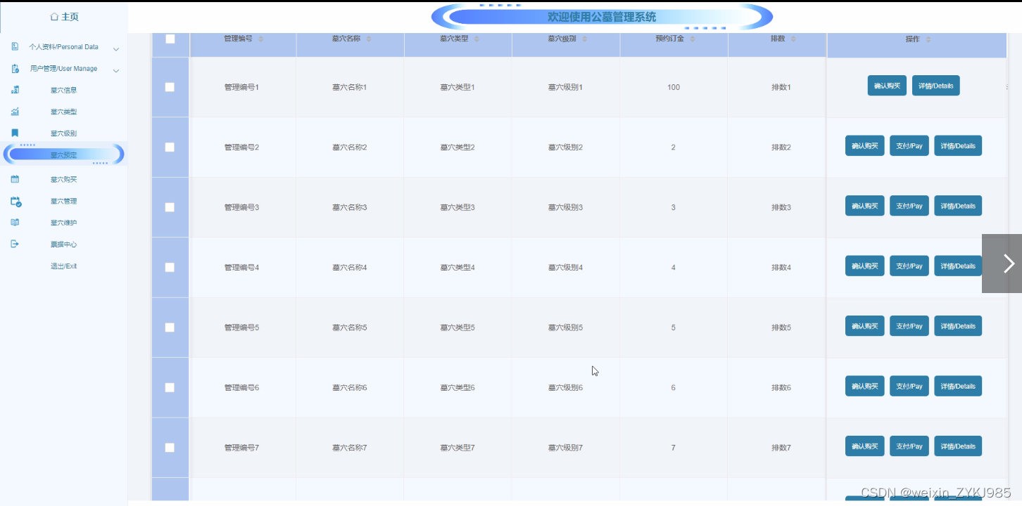 墓穴购买管理,在墓穴购买管理查询页面可以查看管理编号、墓穴名称、墓穴类型、墓穴级别、排数、列数、订购用户、碑文文件、亡者姓名等内容操作,并可在该页面进行编辑删除详情等操作,如图5-7所示: