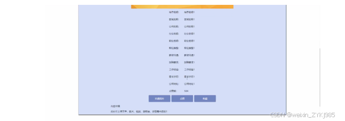 当用户点击前台“职位信息”按钮后就可以看到所有的职位信息列表,选择你想要了解的职位信息后将会进入该职位信息的详情界面,可以了解到城市名称、区域名称、公司名称、行业名称、职位名称、职位类型、薪资待遇、招聘要求、工作经验、要求学历、公司地址、内容详情等信息,可以投递简历、点赞、收藏、和发表评论,职位信息详情界面如下图5-6所示。