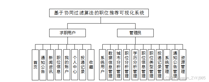 基于协同过滤算法的职位推荐可视化系统的设计与实现的主要使用者分为管理员和求职用户,实现功能包括管理员:系统用户、数据信息管理、城市分析管理、职位分析管理、学历分析管理、职位信息管理、职位类型管理、投递记录管理、系统管理、通知公告管理、资源管理模块,求职用户:首页、通知公告、新闻资讯、职位信息、我的账户、个人中心等功能。由于本网站的功能模块设计比较全面,所以使得整个职位推荐可视化系统信息管理的过程得以实现。