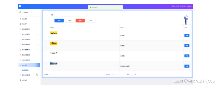 职位推荐可视化系统中的管理人员在“系统管理”这一菜单下是可以对职位推荐可视化系统内的轮播图进行添加修改的,其管理界面如下图5-9所示。