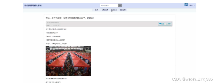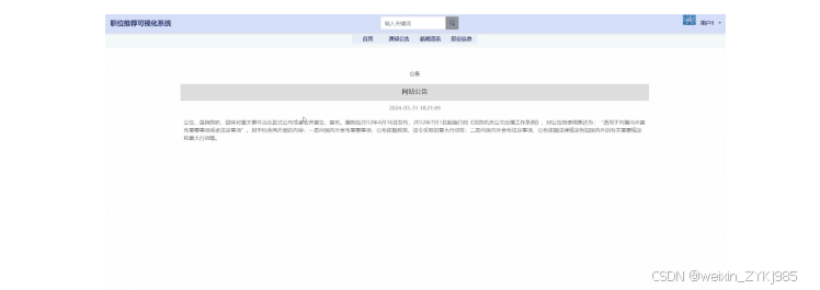 当访客点击职位推荐可视化系统中导航栏上的“通知公告”后将会进入到该“通知公告”列表的界面,然后选择想要看的通知公告,点击进入到详细界面。通知公告列表展示界面如下图所示。