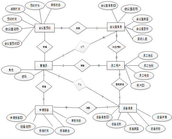 Springboot的智能办公室管理系统的设计与实现系统网站中管理员、员工用户、会议室信息、设备信息、预约会议室、申请报修等E-R实体关系图。
