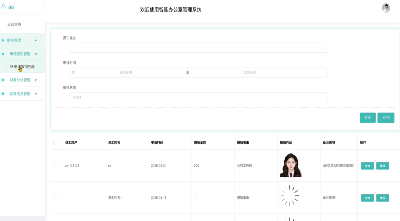 1)申请报销管理:包含申请报销列表和申请报销添加功能,申请报销列表:主要管理和查所有员工申请报销信息,并进行审核。支持增删改查等操作;申请报销添加:可手动添加新的申请报销数据。