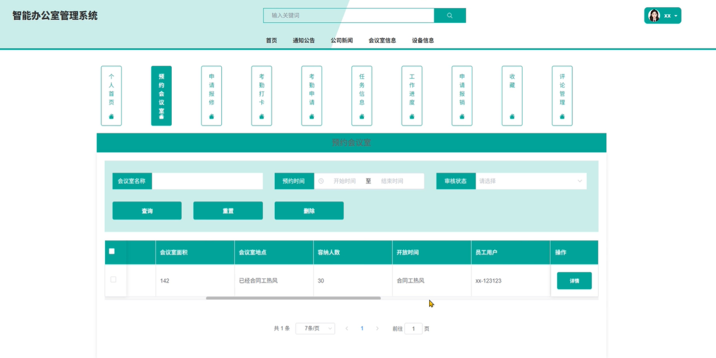 (9)个人中心:个人中心包含个人首页、预约会议室信息、申请报修、考勤打卡、申请考勤、任务信息、工作进度、申请报销、收藏、评论管理等功能,预约会议室:主要查看该员工预约会议室进度;申请报修:主要展示该员工申请报修进度。考勤打卡:主要展示该员工的考勤打卡记录;申请考勤:主要展示该员工申请加班记录;任务信息:主要展示该员工任务信息记录;工作进度:主要展示该用户的工作进度;申请报销:主要查看该员工申请报销进度;收藏:员工可选择自己需要喜欢的会议信息放到自己的收藏夹,方便自己下次查看预约。评论管理:员工可查看系统评论信息和交流心得注意事项等功能。