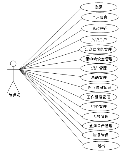 Springboot的智能办公室管理系统的设计与实现中管理员涉及登录、个人信息、修改密码、系统用户、会议室信息管理、会议室预约管理、资产管理、考勤管理、任务信息管理、工作进度管理、财务管理、系统管理、通知公告管理、资源管理等,管理员用对应例图如图3.3所示。