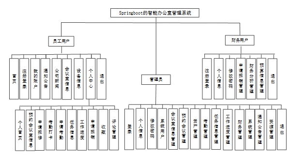 Springboot的智能办公室管理系统的设计与实现包含员工用户、财务用户和管理员三个角色划分,每个角色对应的主要功能如下: