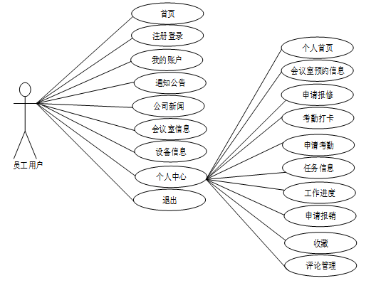 Springboot的智能办公室管理系统的设计与实现中员工用户包含注册登录、首页、我的账户、公司新闻、通知公告、会议室信息、设备信息、个人中心等功能模块,员工用户对应角色用例图如图3.1所示: