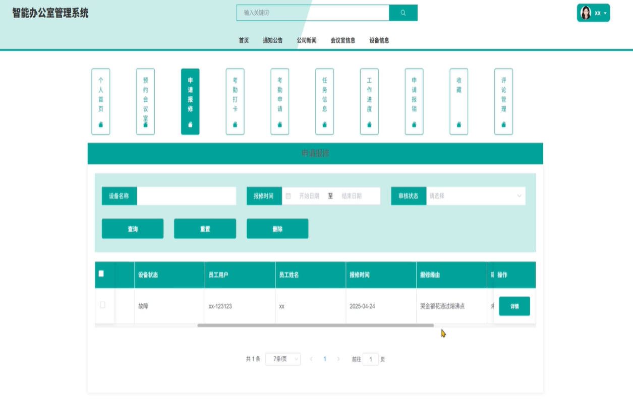 个人中心:个人中心包含个人首页、预约会议室信息、申请报修、考勤打卡、申请打卡、任务信息、工作进度、申请报销、收藏、评论管理等功能,预约会议室:主要查看该员工预约会议室进度;申请报修:主要展示该员工申请报修进度。考勤打卡:主要展示该员工的考勤打卡记录;申请:主要展示该员工申请加班记录;任务信息:主要展示该员工任务信息记录;工作进度:主要展示该用户的工作进度;申请报销:主要查看该员工申请报销进度;收藏:员工可选择自己需要喜欢的会议信息放到自己的收藏夹,方便自己下次查看预约。评论管理:员工可查看系统评论信息和交流心得注意事项等功能。预约会议室信息如图5-5所示。申请报修如图5-5所示