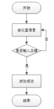 添加会议室信息,输入会议室名称、会议室类型、会议室面积等信息,并校验输入是否正确,会议室信息添加流程图,如图所示:
