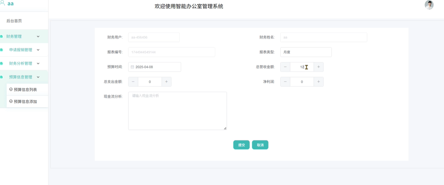 3)预算信息管理:包含预算信息列表和预算信息添加功能,预算信息列表:主要管理和查看财务添加的预算信息,支持增删改查等操作;预算信息添加:可手动添加新的预算信息数据。