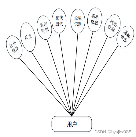 1.普通用户主要使用系统的微信小程序的垃圾分类识别查看首页、通知公告、新闻资讯、在线测试、垃圾识别、基本信息、我的收藏等,下图所示为用户的用例图。