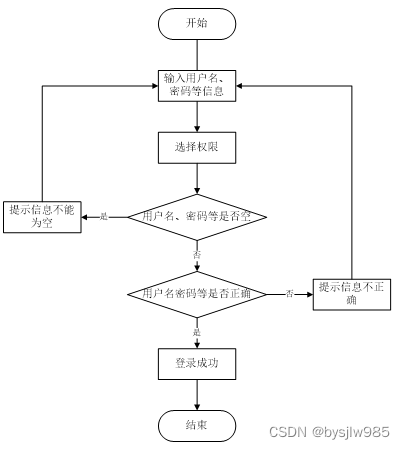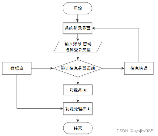 用户想进入系统,首先进入系统登录界面,通过正确的用户名、密码,选择登录类型登录,系统会检查登录信息,信息正确,然后输入相应的功能界面,提示信息错误,登录失败。系统操作流程如图3-4所示。