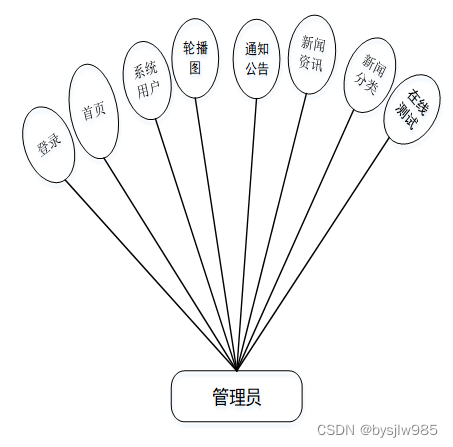 2.管理员主要负责首页、个人中心、轮播图、通知公告、系统用户、资源管理(新闻资讯、新闻分类、在线测试)等功能模块,下图所示描述管理员的用例图。