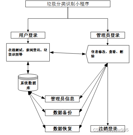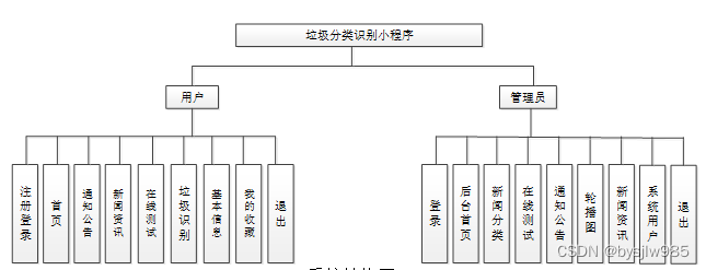 系统架构图属于系统设计阶段,系统架构图只是这个阶段一个产物,系统的总体架构决定了整个系统的模式,是系统的基础。基于微信小程序的垃圾分类识别的整体结构设计如图4-2所示。