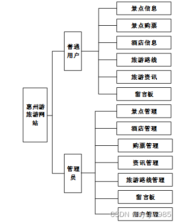 惠州旅游网站的功能主要分为前台用户根据自己的需求进行注册登录,浏览景点信息并对选中的景点进行购票操作。后台系统管理员因职责的不同,分为普通管理员和超级管理员,管理员主要对购票单进行处理,发布酒店信息。