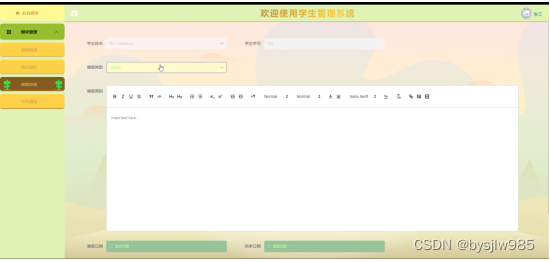 本系统主要采用了Java技术,将所有业务模块采用以浏览器交互的模式,选择MySQL作为系统的数据库,开发工具选择My eclipse来进行系统的设计。基本实现了学生管理系统 应有的主要功能模块,本系统有管理员、教师用户、学生用户。管理员:后台首页、个人资料(个人信息、修改密码)、系统用户(管理员、教师用户、学生用户)、模块管理(销假管理、防控登录、请假申请、公告通知)。学生用户;后台首页、个人资料(个人信息、修改密码)模块管理(销假管理、防控登录、请假申请、公告通知)。教师:后台首页、个人资料(个人信息、修改密码)模块管理(销假管理、防控登录、请假申请、公告通知)等功能模块。
