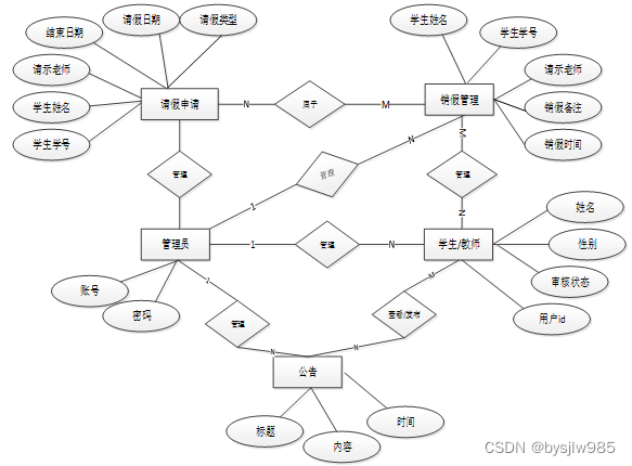 对于一个要开发的系统来说,E-R图可以让别人能更快更轻松的了解此系统的事务及它们之间的关系。根据系统分析阶段所得出的结论确定了在学生管理系统 中存在着多个实体分别是用请假申请、公告通知、防控登记、销假管理等。系统总体ER图如下图所示。