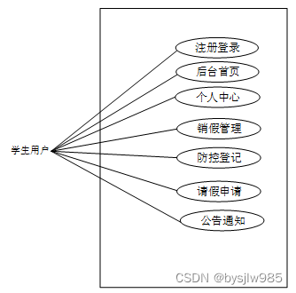 系统设计的目的是分析系统包括的所有功能结构,为开发人员设计开发和实现系统做好准备工作。经过前期的需求调查、分析和整理之后,确定的总体需求主要包括多个模块,分别是:后台首页、个人资料(个人信息、修改密码)、系统用户(管理员、教师用户、学生用户)、模块管理(销假管理、防控登录、请假申请、公告通知)。系统整体角色分为三个部分,一是学生用户、二是管理员、三是教师。系统功能结构图如下图所示。