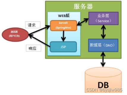 页面发送请求给控制器,控制器调用业务层处理逻辑,逻辑层向持久层发送请求,持久层与数据库交互,后将结果返回给业务层,业务层将处理逻辑发送给控制器,控制器再调用视图展现数据。