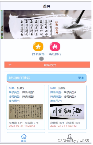 (1)查看诗词打卡微信小程序的首页信息:诗词打卡微信小程序的首页信息包含了首页、打卡活动、活动排行、我的。