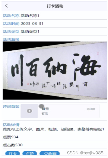 (4)打卡活动:用户可以查看打卡活动,在查询到自己想要了解的打卡活动的时候,可以进入查看详细的介绍,点击“打卡”这一按钮以后会跳转到打卡信息填写的界面,根据提示填写好打卡的信息,点击“提交”以后打卡就完成了,在活动详情这个界面,同时支持用户对喜欢的打卡活动进行收藏、点赞的功能。
