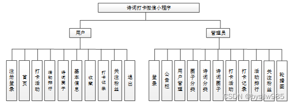 诗词打卡微信小程序划分为了普通用户模块和管理员模块这两大部分。