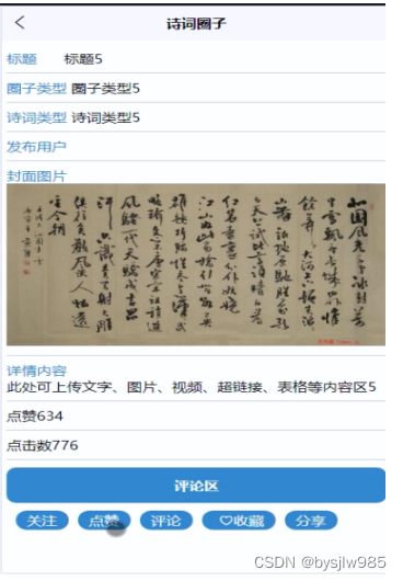 (3)诗词圈子:用户可以查看诗词圈子,在查询到自己想要了解的诗词圈子的时候,可以进入查看详细的介绍,点击“关注粉丝”这一按钮以后会跳转到关注粉丝信息填写的界面,根据提示填写好关注粉丝的信息,点击“提交”以后关注粉丝就完成了,在诗词圈子详情这个界面,同时支持用户对喜欢的诗词进行收藏、点赞、评论、分享的功能。