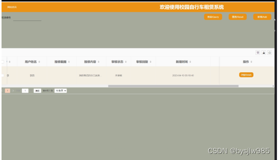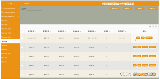 单车租赁管理:可以查看租用号、管理序号、单车名称、单车类型、租用单价、租用标准、信用金、普通用户等信息,可以进行查询、删除、新增等操作,如下图所示。