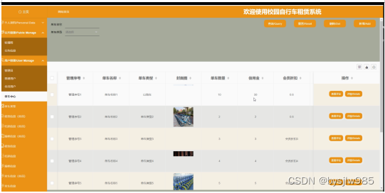 单车中心:可以查看单车的管理序号、单车名称、单车类型、封面图、信用金、租用单价、单车数量、租用标准等信息。可以进行查询、新增、删除、修改等操作,如下图所示。