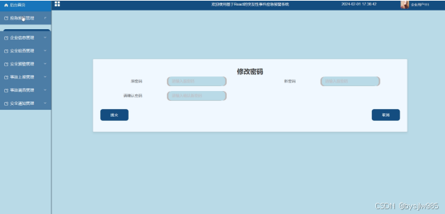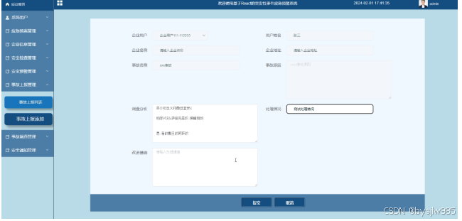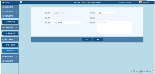 当进入突发性事件应急预警系统的时候,企业用户可以点击“事故上报管理”进行事故上报信息提交,管理员在后台管理端对事故上报信息进行事故调查。企业用户提交事故上报界面如下图5-8所示。