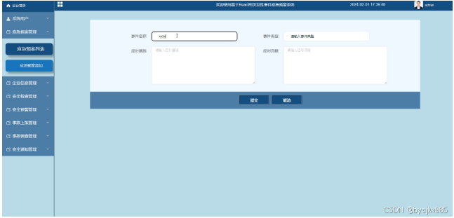 | 测试流程 | 1)管理员点击应急预案信息管理,然后点击添加后并填写信息。 2)点击进行提交。 |