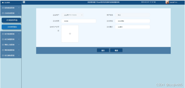 (4)企业信息管理:企业用户点击“企业信息管理”可以查看所有已添加的企业信息列表,点击“添加”可以添加新的企业信息,输入企业用户、用户姓名、企业名称、企业地址、安全生产许可证、企业简介等信息完成添加。