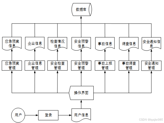 (3)确定好系统使用的技术,进行确认系统所划分的用户触,并且根据用户触划分确定所要设计的功能模块,对突发性事件应急预警系统的设计主要划分别为管理员和用户,并且所使用的功能模块也相应不同,但系统的数据库实现的内容是交互的,用户可以随时根据自己的需求进行信息搜索,对于系统工作人员可以根据自己的分管内容进行在线信息的处理及操作,管理员获取到所有用户的详细数据信息,并根据需求进行第一时间处理解决。
