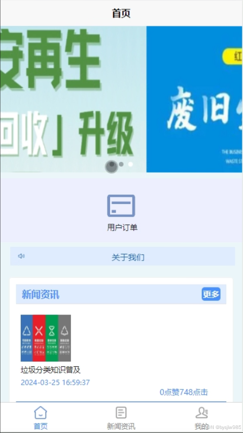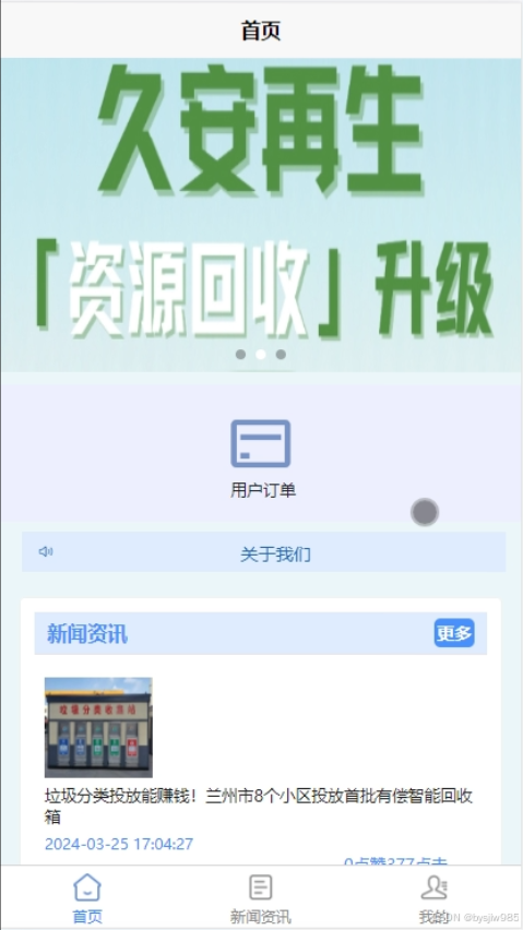回收人员注册登录之后可以在首页查看用户订单,新闻资讯,选择回收订单等,如图5-15所示。