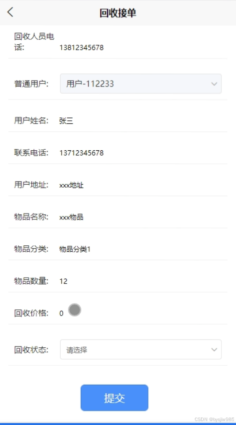 在“回收订单”界面点击“回收接单”输入回收人员姓名、电话、地址、物品名称、物品分类、物品数量、回收价格和回收状态等,点击提交即能接单。其界面如下图5-16所示。